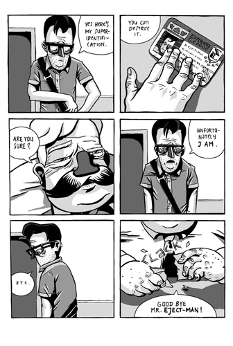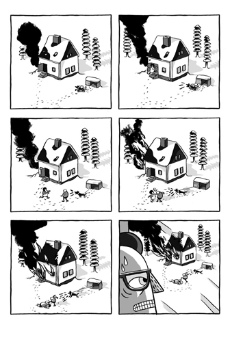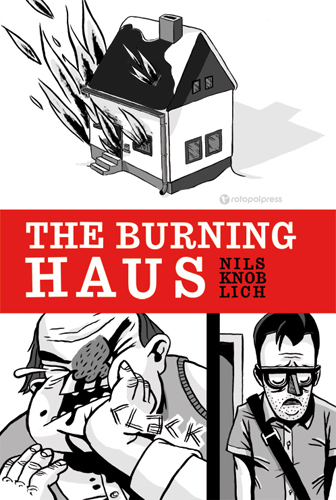 The Burning Haus Nils Knoblich Comic, 14 Seiten 15,5 x 23,3 cm Bleistift, Tusche & Digital, 2008 Ein Haus geht in Flammen auf. Ein Mann verprügelt seine Frau. Ein Superheld schreitet ein, doch sein Unterbewusstsein zwingt den „Eject-Man“ seine Passion radikal in Frage zu stellen. Welche Konsequenzen hat es, wenn ein Superheld selbst zum Schurken wird? Erschienen bei rotopolpress