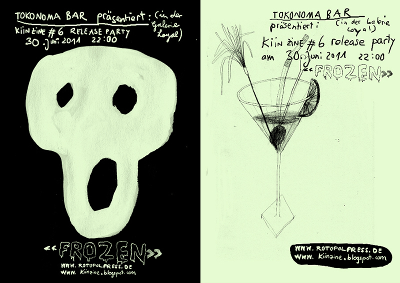 Tokonoma fühlt sich sehr geehrt an diesem Tag exklusiv den Release des neuen und sechsten Kiin Zine zu präsentieren! Das neue Fanzine der Geißer-Schwestern (Studenten und Lokalmatadorinnen der Kunsthochschule Kassel und der Burg Giebichenstein Halle) behandelt das Thema “Frozen” und hat Daniel Von Bothmer als Gastkünstler geladen. Zu sehen gibt es eine fulminante Ausstellung mit den ultra-neuen Kiin-Werken, zu hören gibt es frostbeulige Stimmungsmusik und zu essen und zu trinken gibt es auch was mit “Frozen” und so. Also ein Kultur-Themenabend der Güteklasse A. Kommen!