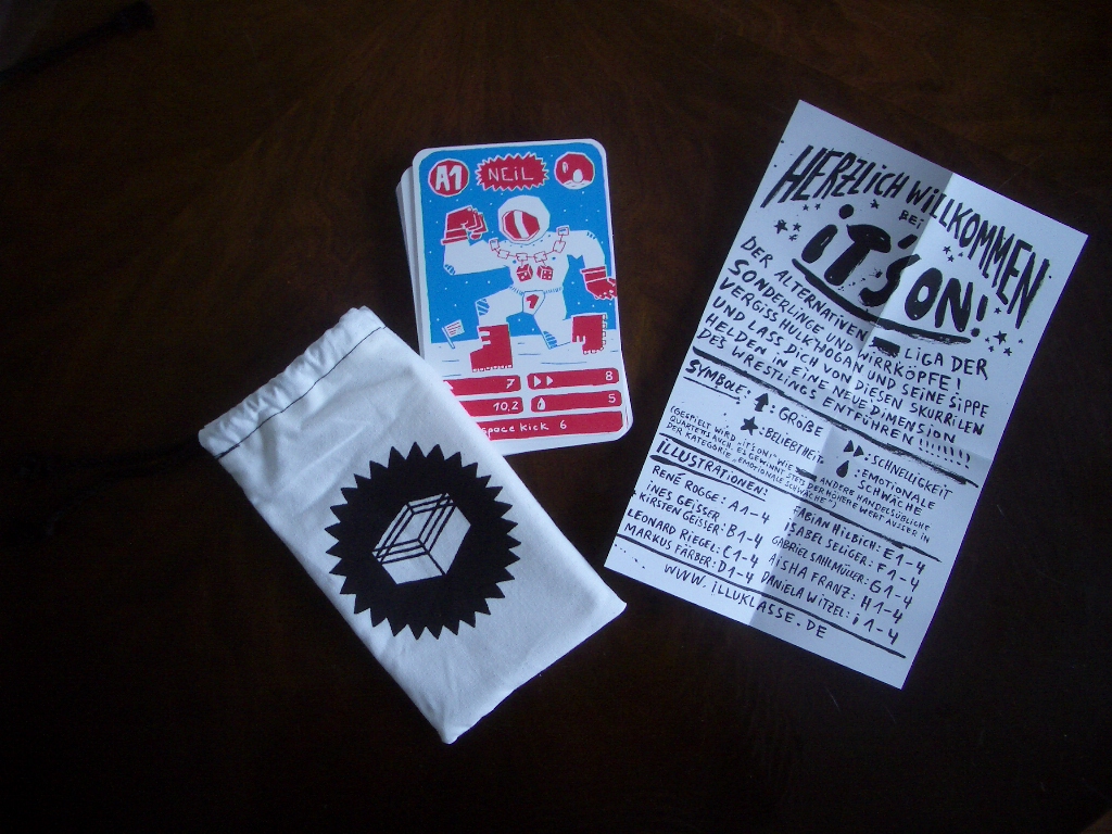 Herzlich Willkommen bei „it’s on!“, der alternativen Liga der Sonderlinge und Wirrköpfe! Vergiss Hulk Hogan und seine Sippe und lass dich von diesen skurrilen Helden in eine neue Dimension des Wrestlings entführen! mit dabei: René Rogge, Ines Christine Geisser und Kirsten Carina Geisser, Leonard Riegel, Markus Färber, Fabian Hilbich, Isabel Seliger, Gabriel Sahlmüller, Aisha Franz, Daniela Witzel 2-farbiges Siebdruckquartett im hübschen Stoffbeutel 1.Auflage, 100 Exemplare nur 14,00 €!