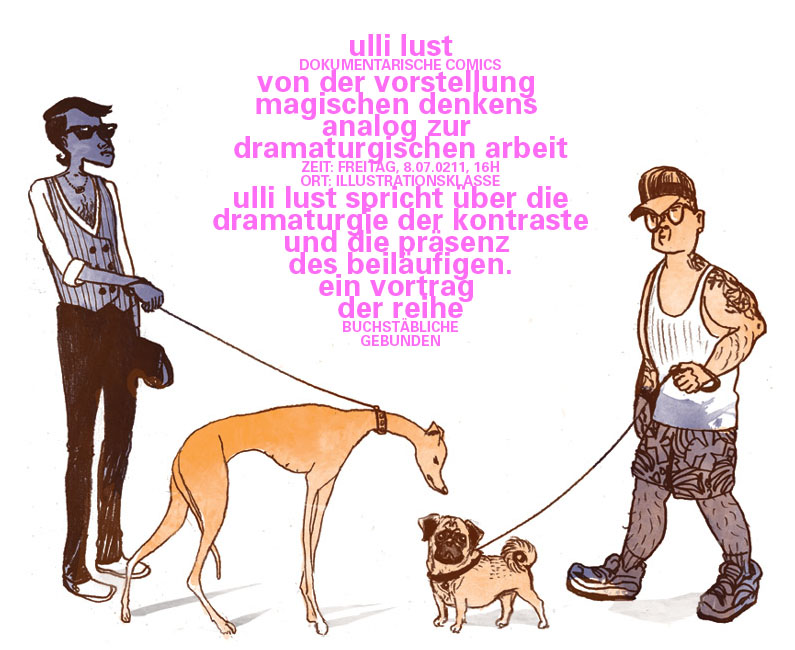 Freitag, 8.07.2011, um 16h im Klassenraum Illustration „Dokumentarische Comics – von der Vorstellung magischen Denkens analog zur dramaturgischen Arbeit“. Wer erzählen will, muss Sinn für Kontraste haben – der gute Beobachter braucht den präzisen Blick für das Bestimmte im Ungefähren … ULLI LUST Comiczeichnerin & Betreiberin des Webcomic-Verlags electrocomics.com Nur allzu bekannt aus Funk & Fernsehen und in beinahe obszöner Weise mit Preisen überhäuft, ist Ulli Lust trotz des unverschämten Erfolges ihrer überbordenden Autobiographie „Heute ist der letzte Tag vom Rest deines Lebens“ in Deutschland und Frankreich – nebst bevorstehender Ausgaben in weiteren sechs Sprachen – so felsenfest auf dem Boden geblieben, dass sie sich bereit erklärte, sich speziell für uns ins klammouröse Kassel zu begeben … www.ullilust.de/“ rel=“noopener noreferrer nofollow“>www.ullilust.de/