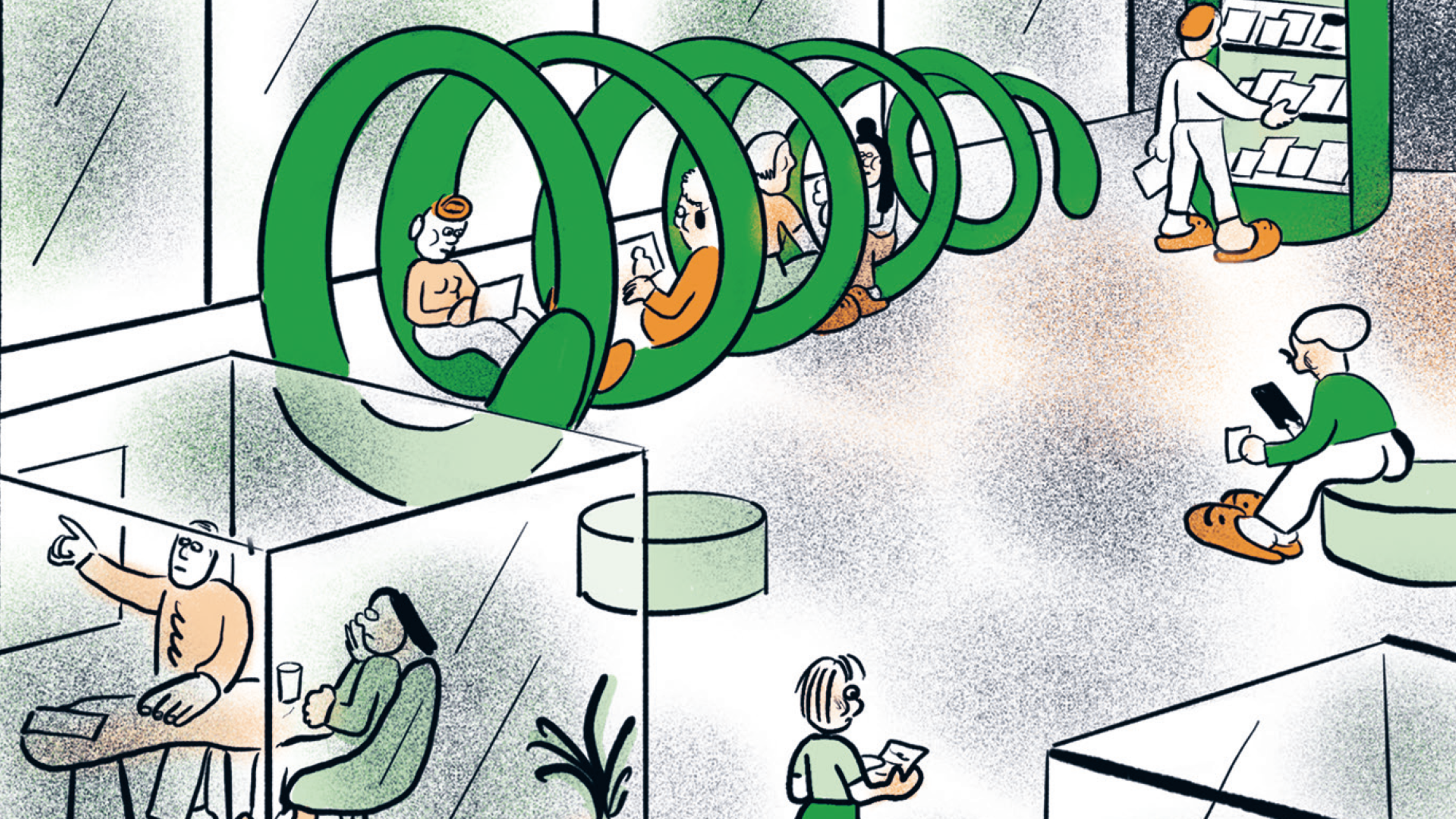 „In ihrem Comic „Work-Life-Balance“ erzählt Aisha Franz sehr witzig und ein bisschen surreal von den beruflichen Kämpfen junger Großstädter – zwischen Bullshit-Jobs, Burn-outs und Büros, die wie Kinderspielplätze aussehen.“